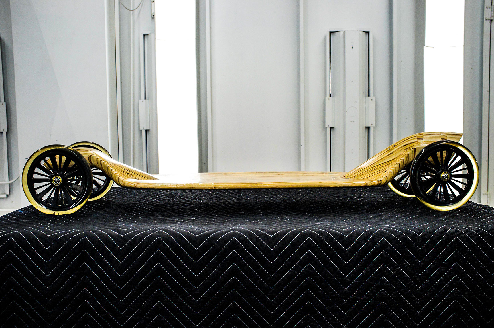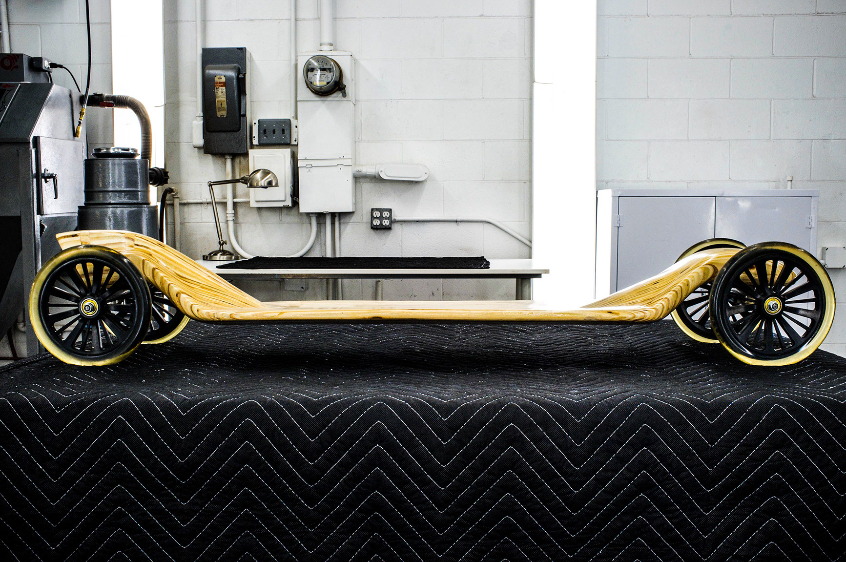 Vertically Oriented Birch plywood with internally mounted Independent 215 Trucks. Saturated with fiberglass resin and then topped with House of Kolor clear coat. 180mm Wheels. 46" Long, 8.5" wide, 3" deck height. Custom shapes and sizes available. Prices starting at $1350