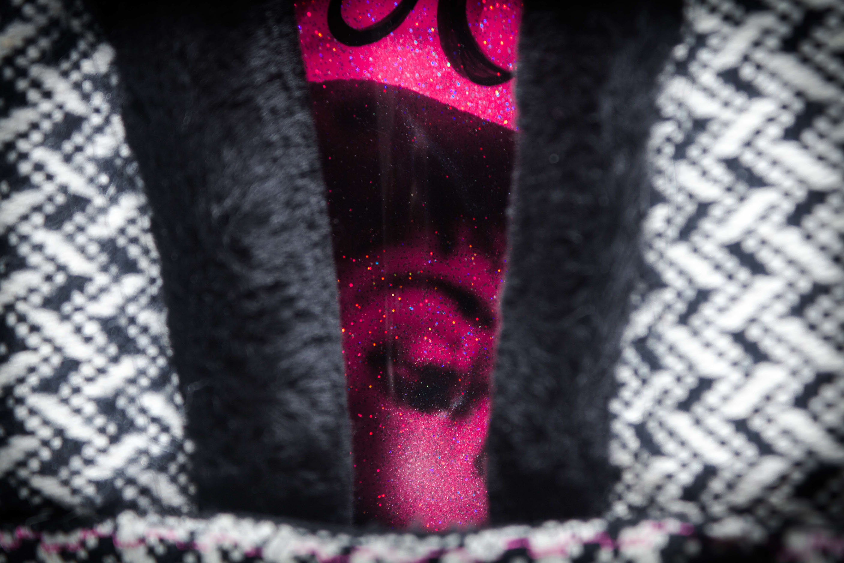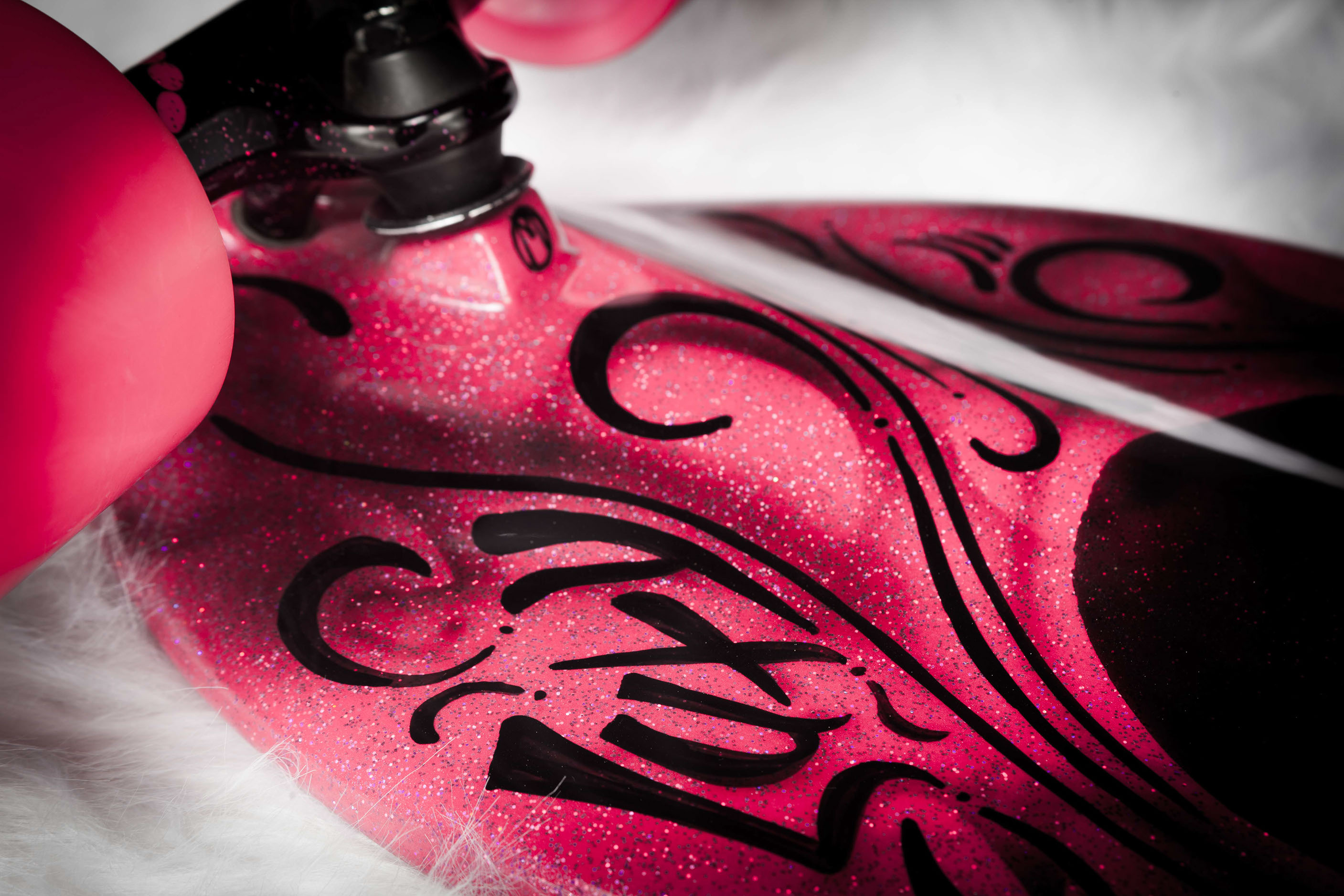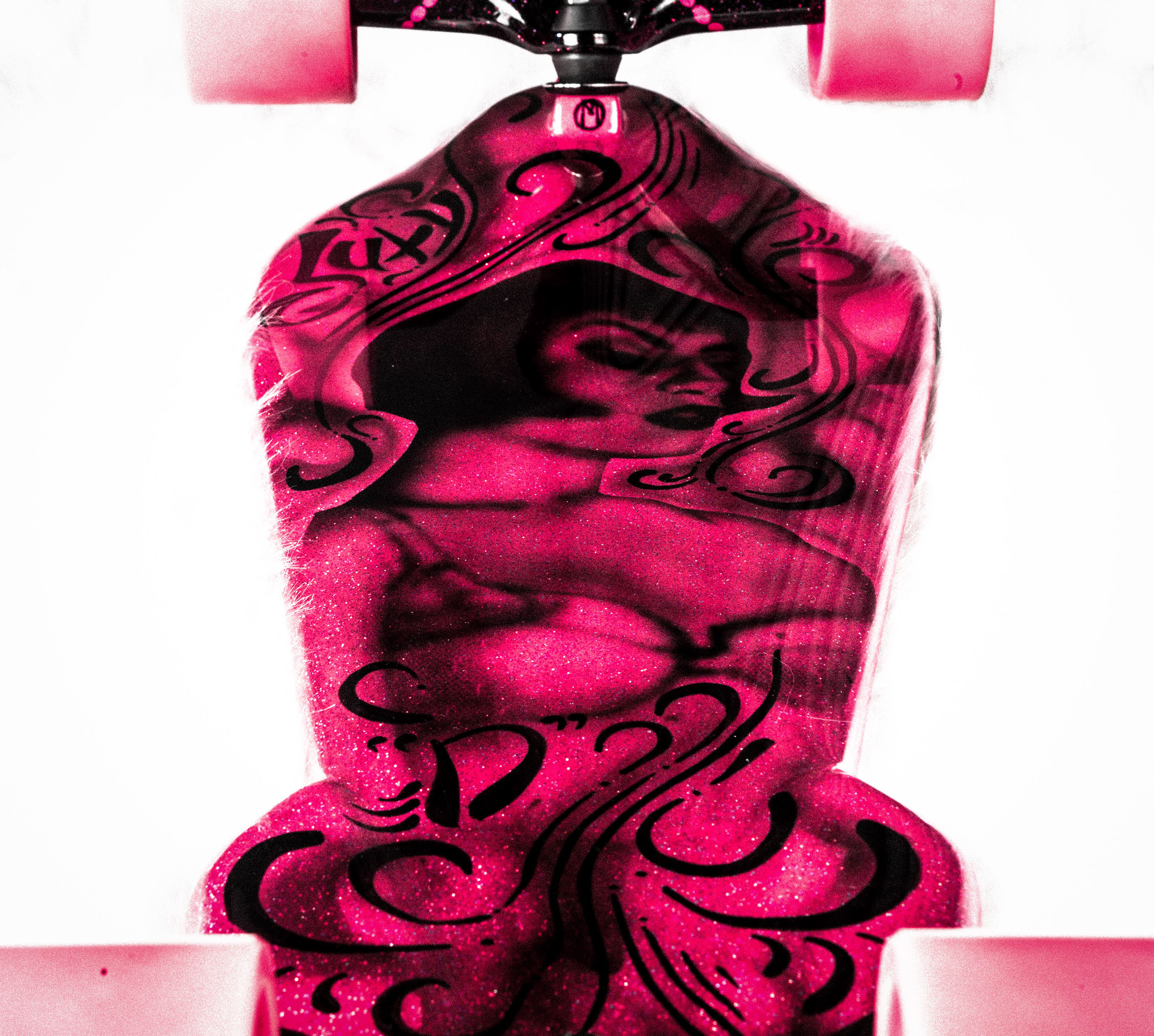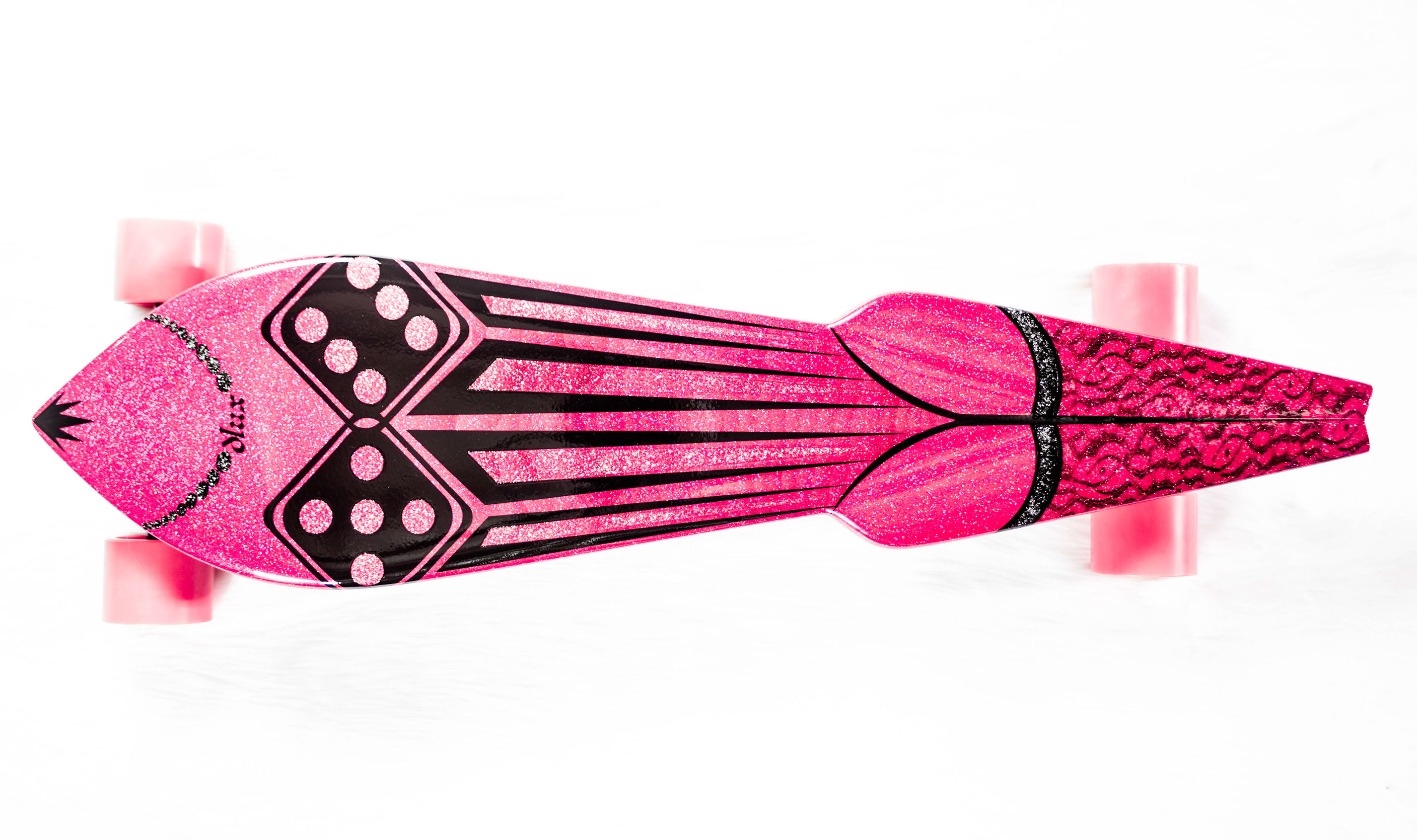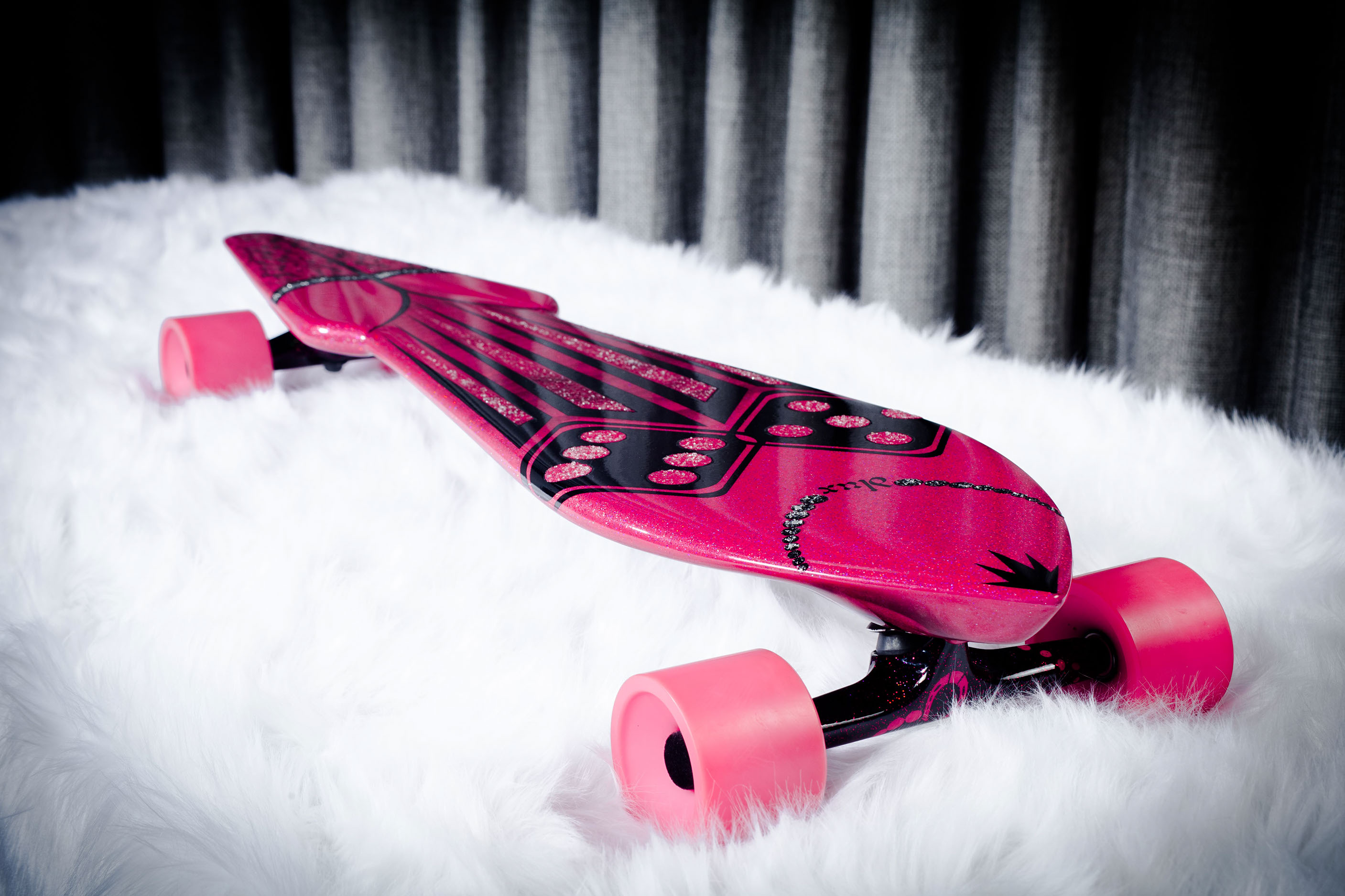 Fiberglass over Birch plywood construction, with paint matched Independent 215(Front) and 169(Rear). Color matched internally mounted trucks and 75mm wheels with black fur bearing covers. Custom mixed Pink Base with Pink and Purple Metal Flake under Jet Black House of Kolor Paint and Clear Coat polished to a high gloss. Crushed Glass Grip. 35"Long, 9"Wide, 4.75"Deck Height. Ready to paint deck: $850 As pictured: $1750 Custom Paint Schemes Available.