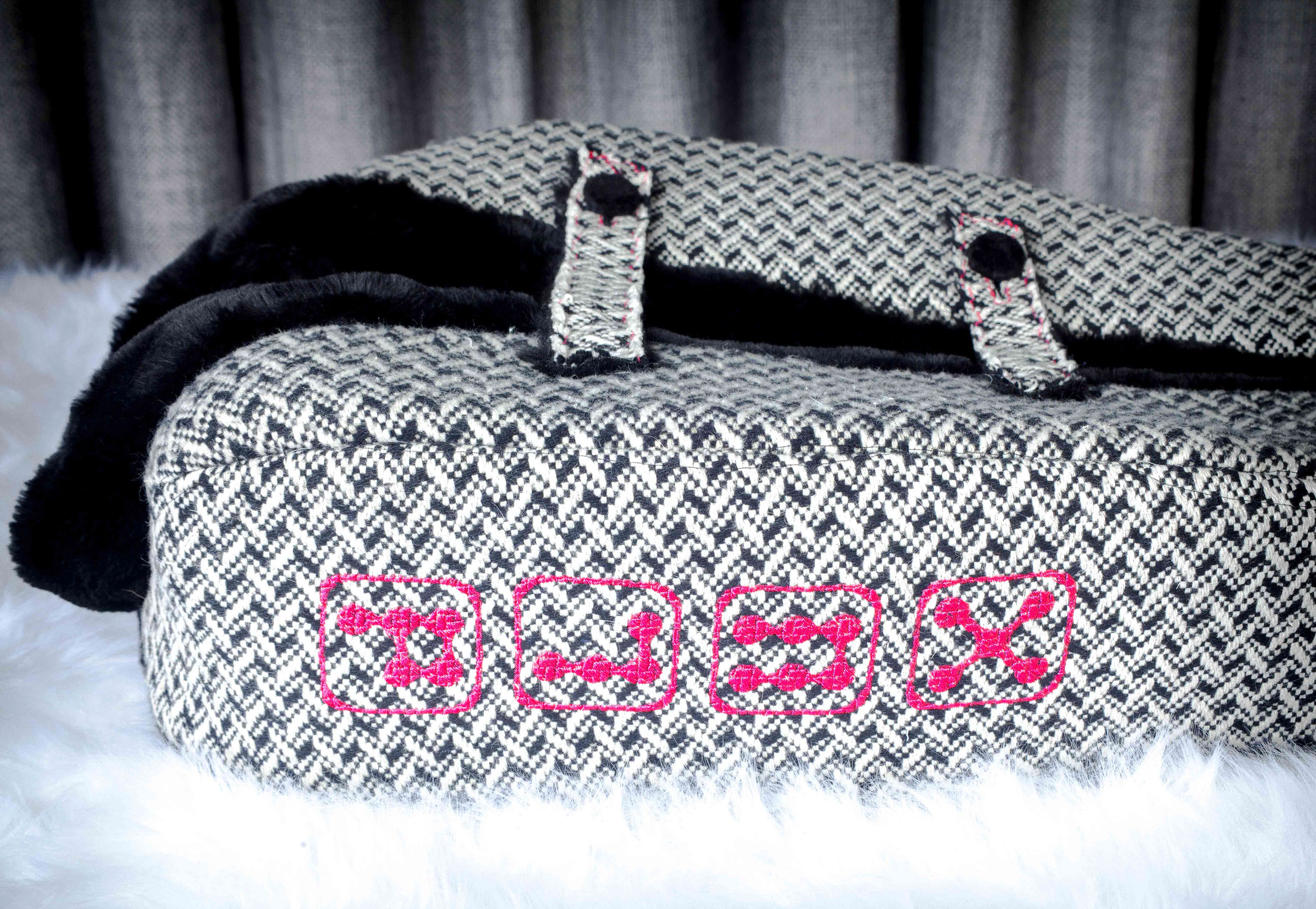 Jacket Style Wool Carrying Bag with Nylon Lining over 1/2" Foam. Pink embroidery and fur trim: $425