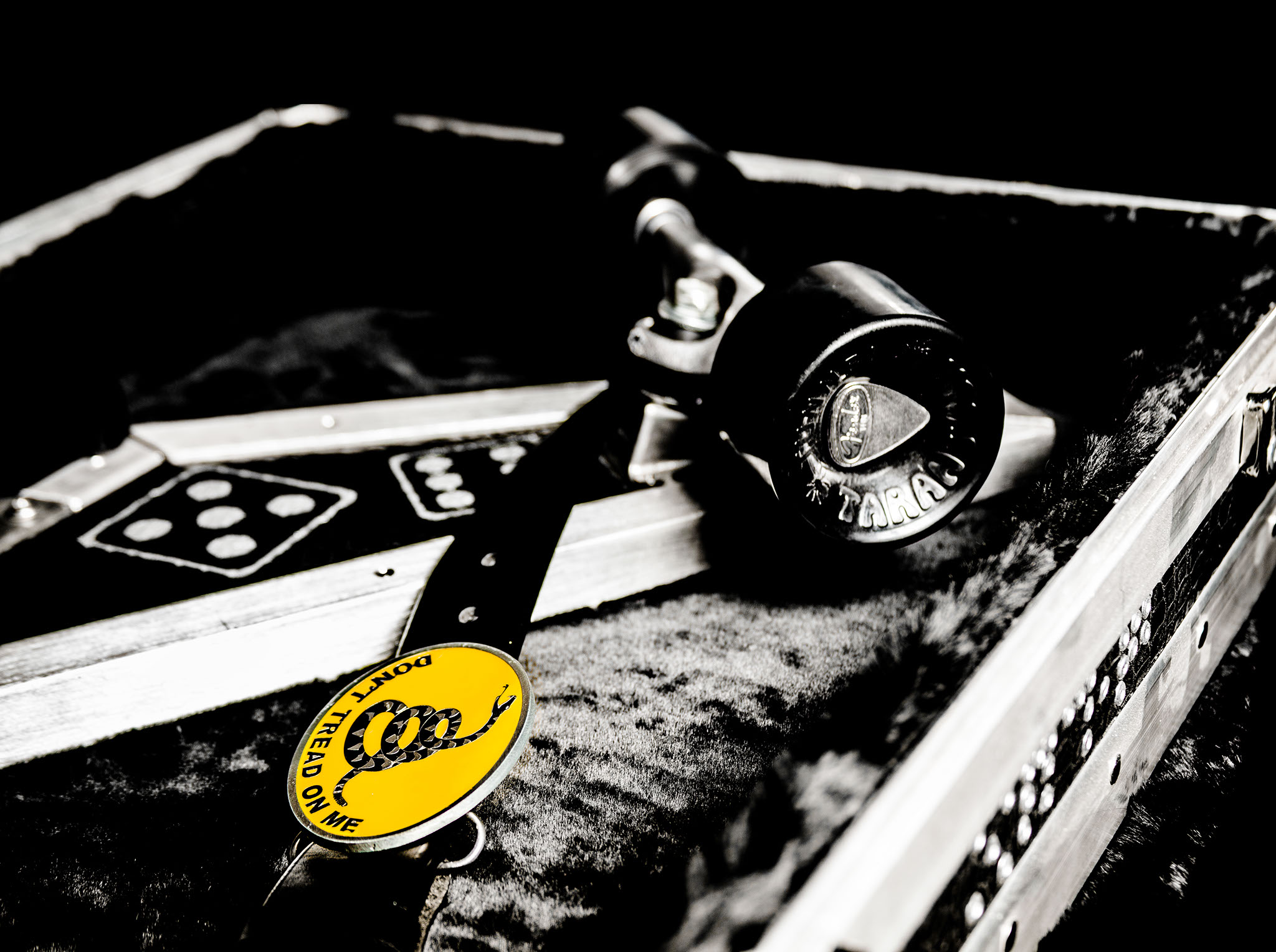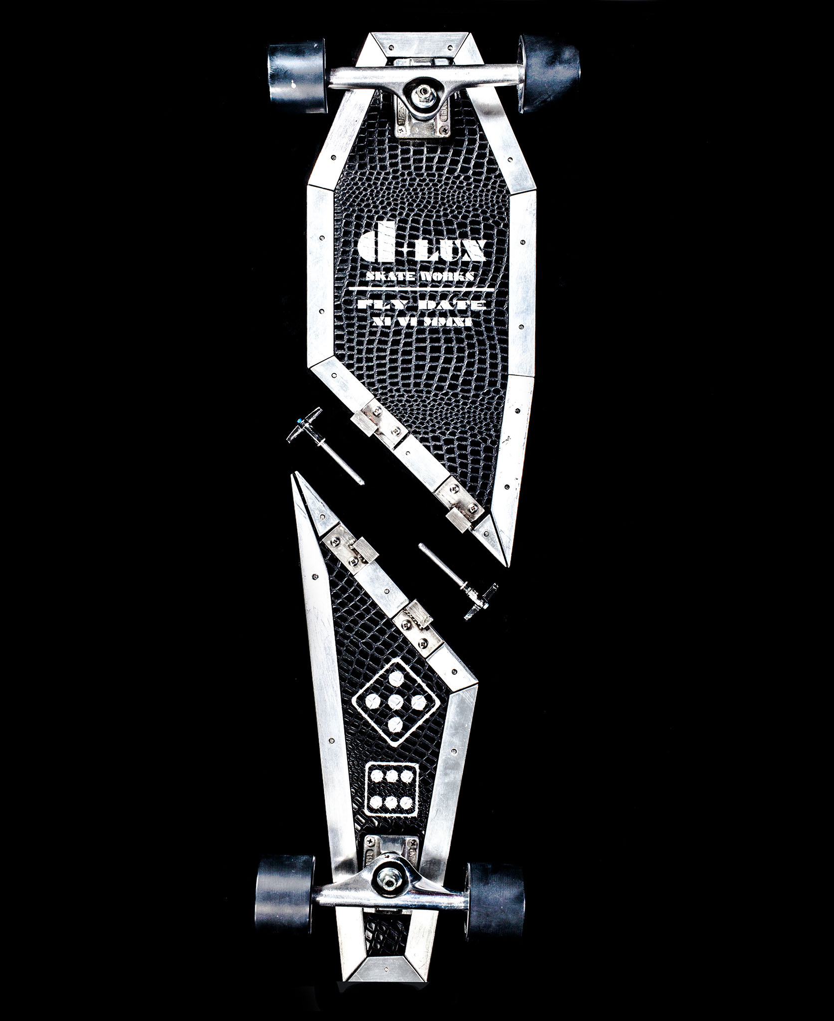 This board is tour ready! Wood Core covered in snake skin vinyl with aluminum trim. Stainless Steel hardware and quick-release pins. Independent Trucks with Tunnel Tarantula Wheels and Guitar Pick bearing covers. 31" Long, 8.5" wide, 4" deck height. Price upon Request. One piece version also available.