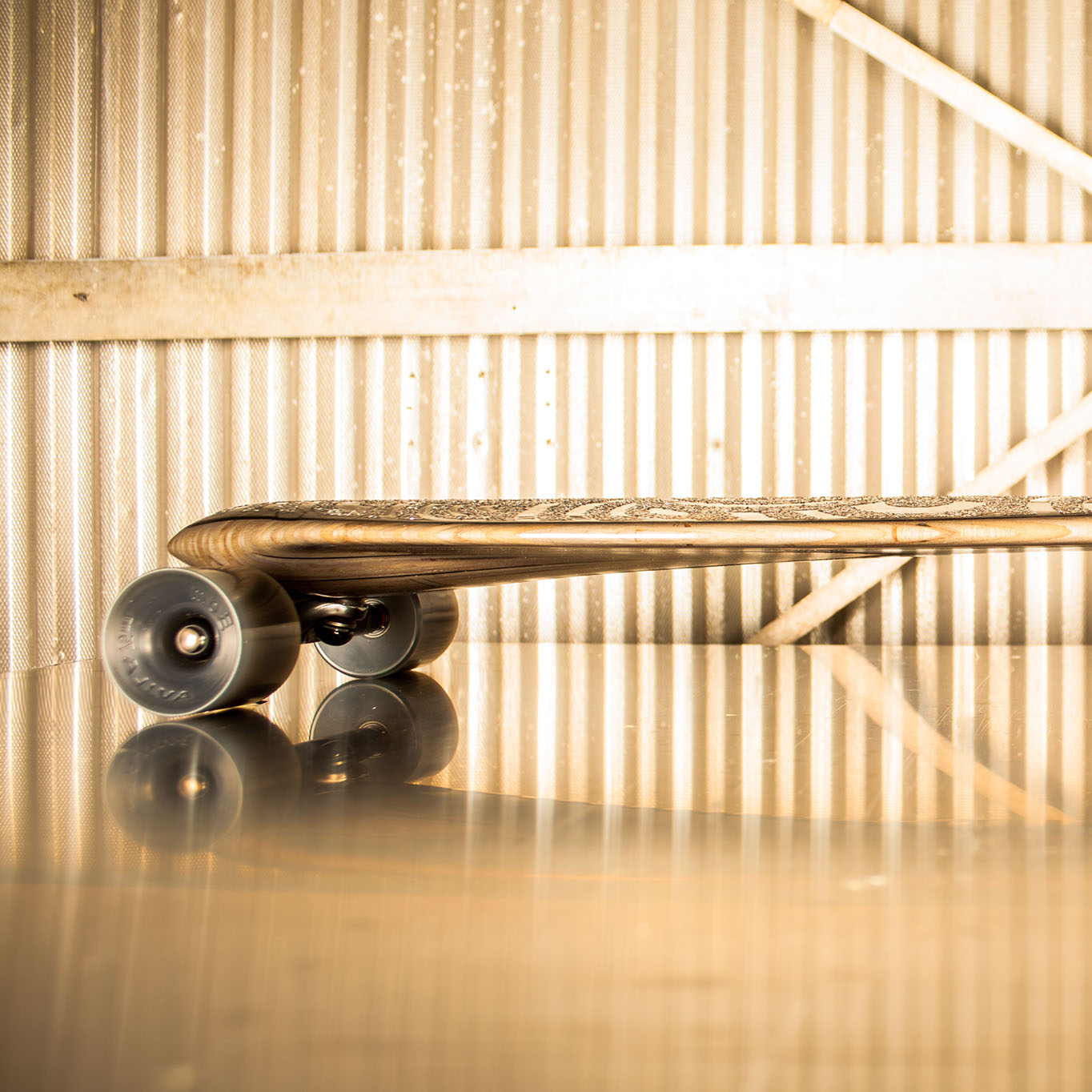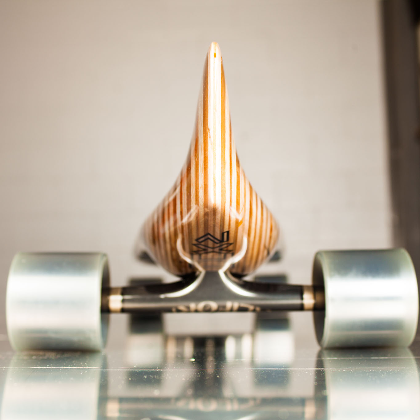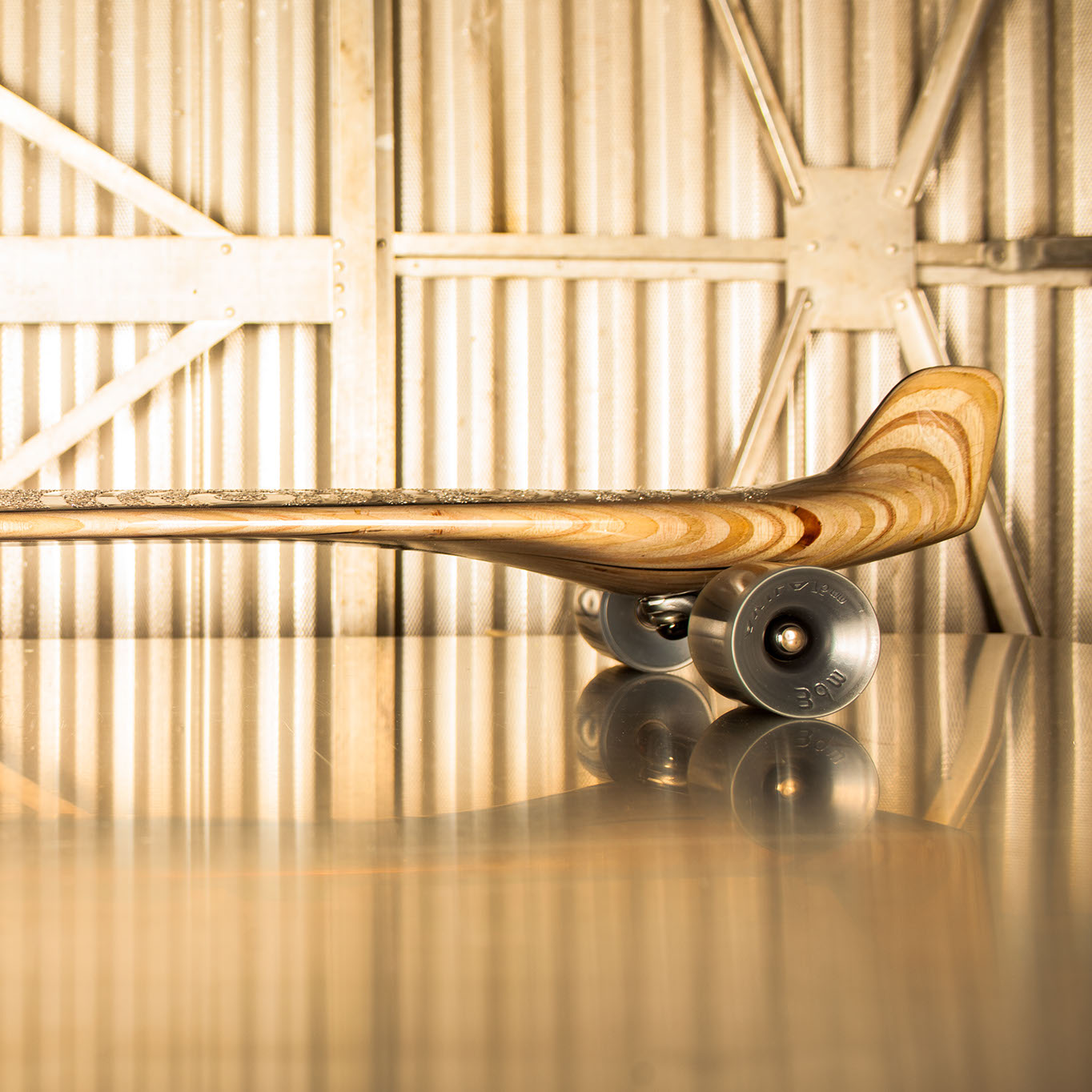 Vertically oriented Birch ply construction with hardware mounted internally. Transparent silver pearl and jet black House of Color Paint covered in a thick clear coat. Radar design crushed glass grip. 75mm 3DM Avila wheels on paint matched Independent 215 trucks with bearing and king pin caps. 42" Long, 9" Wide, 5" Deck Height. Ready to Paint Decks Starting at $1,399.