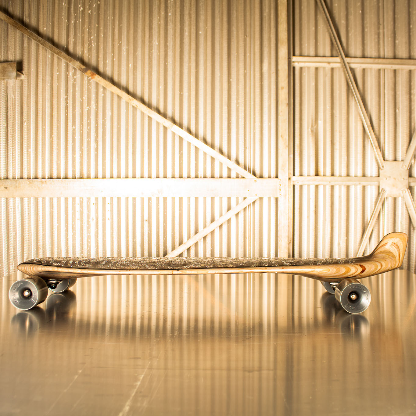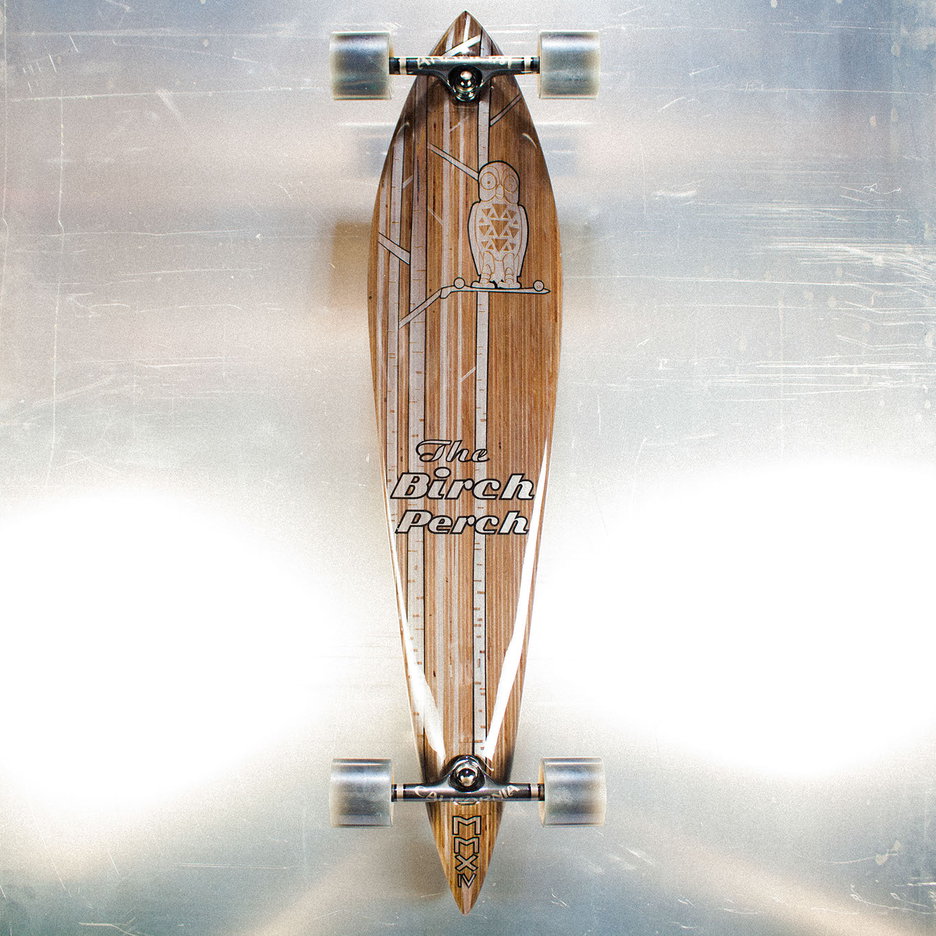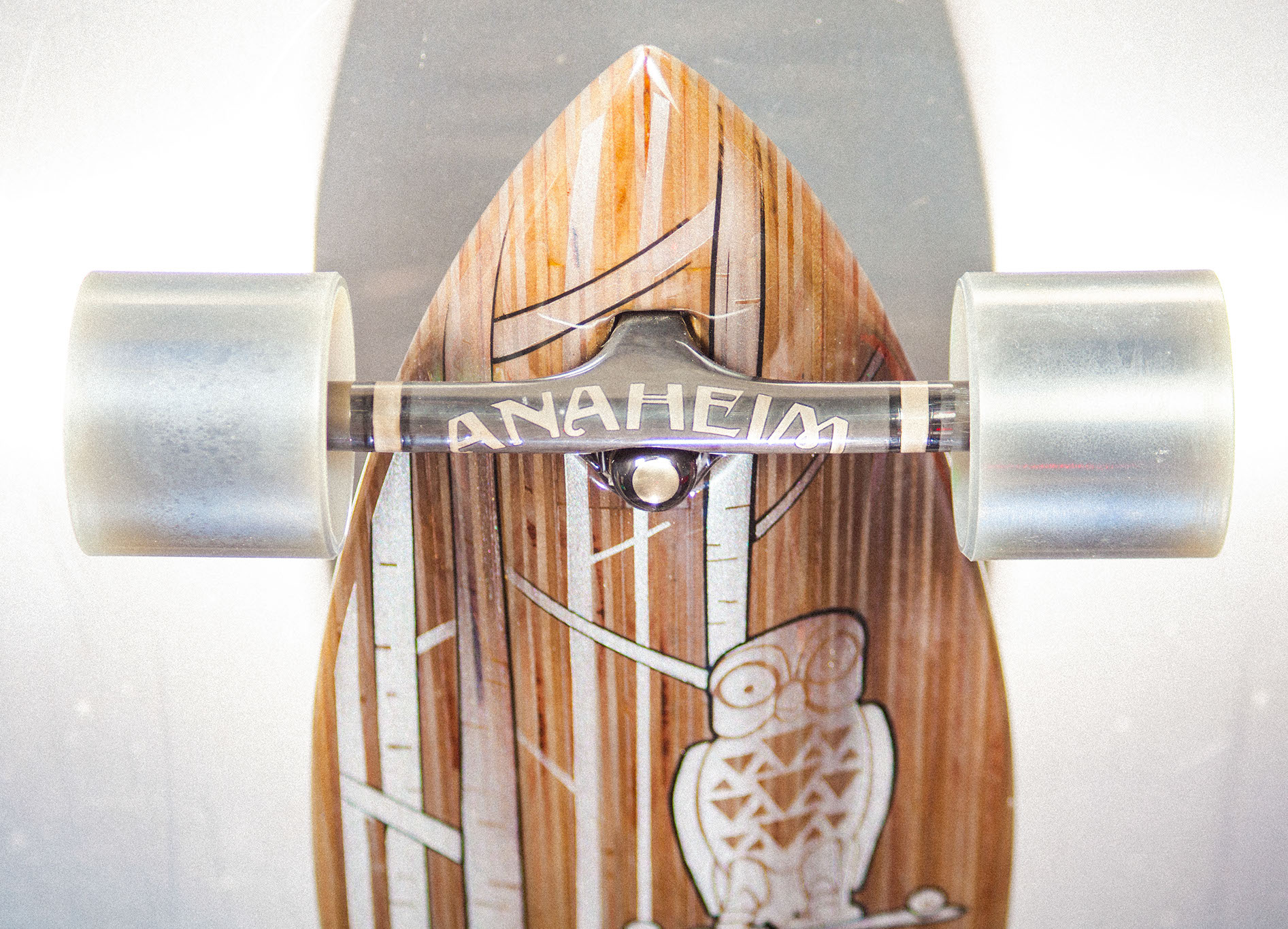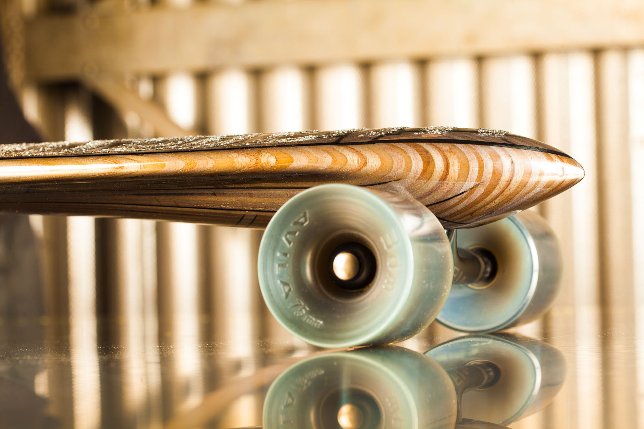 Vertically oriented Birch ply construction with hardware mounted internally. Transparent silver pearl and jet black House of Color Paint covered in a thick clear coat. Radar design crushed glass grip. 75mm 3DM Avila wheels on paint matched Independent 215 trucks with bearing and king pin caps. 42" Long, 9" Wide, 5" Deck Height. Ready to Paint Decks Starting at $1,399.