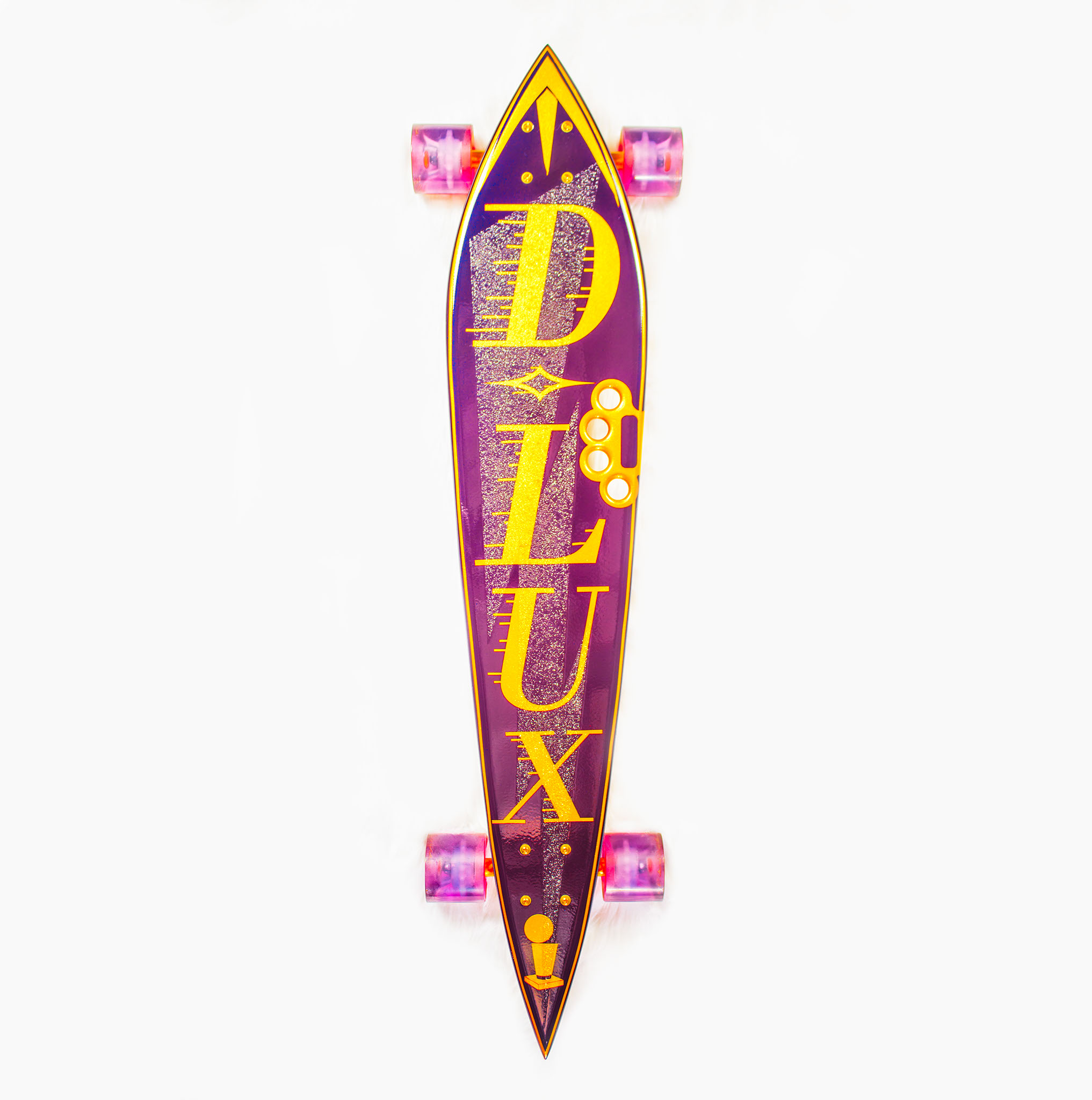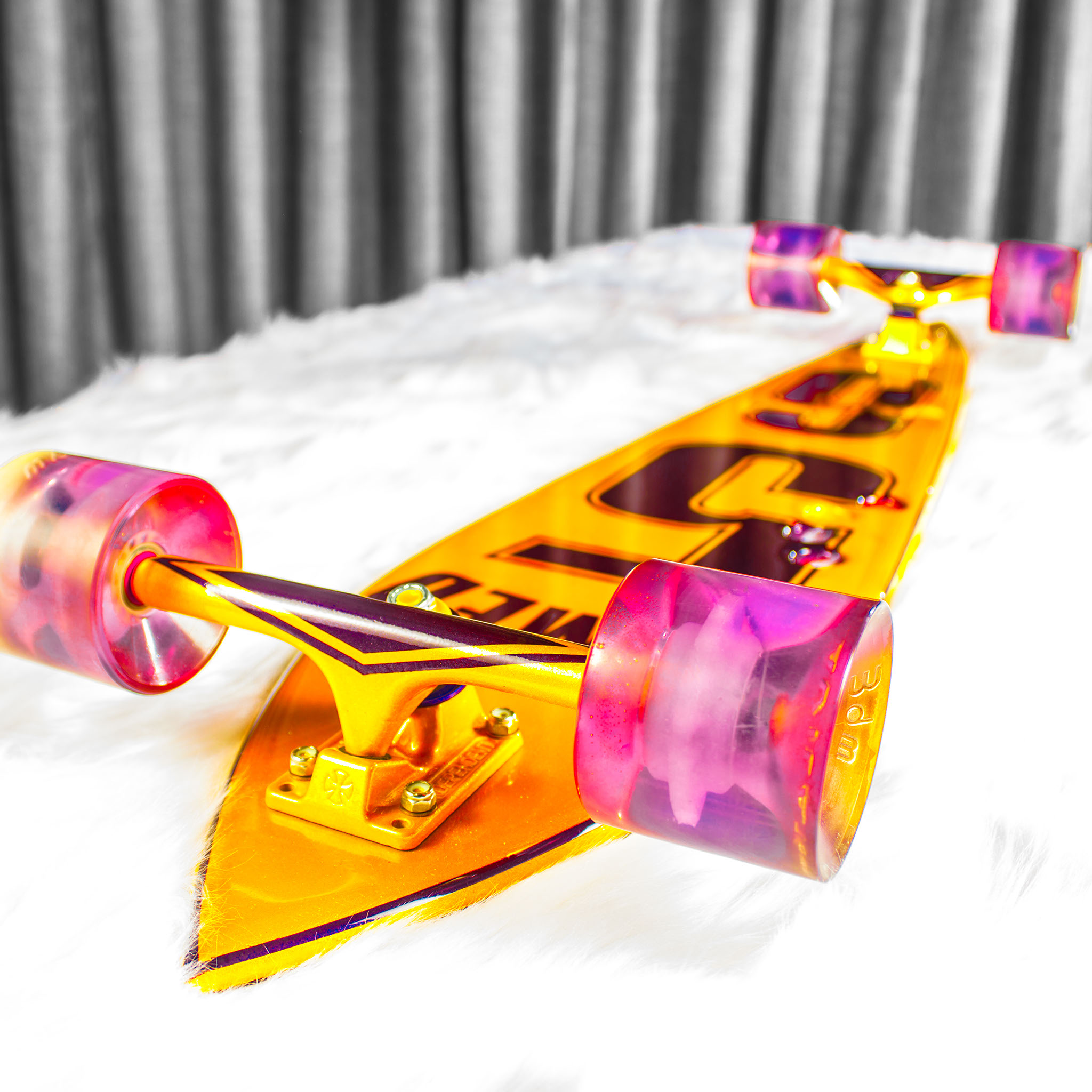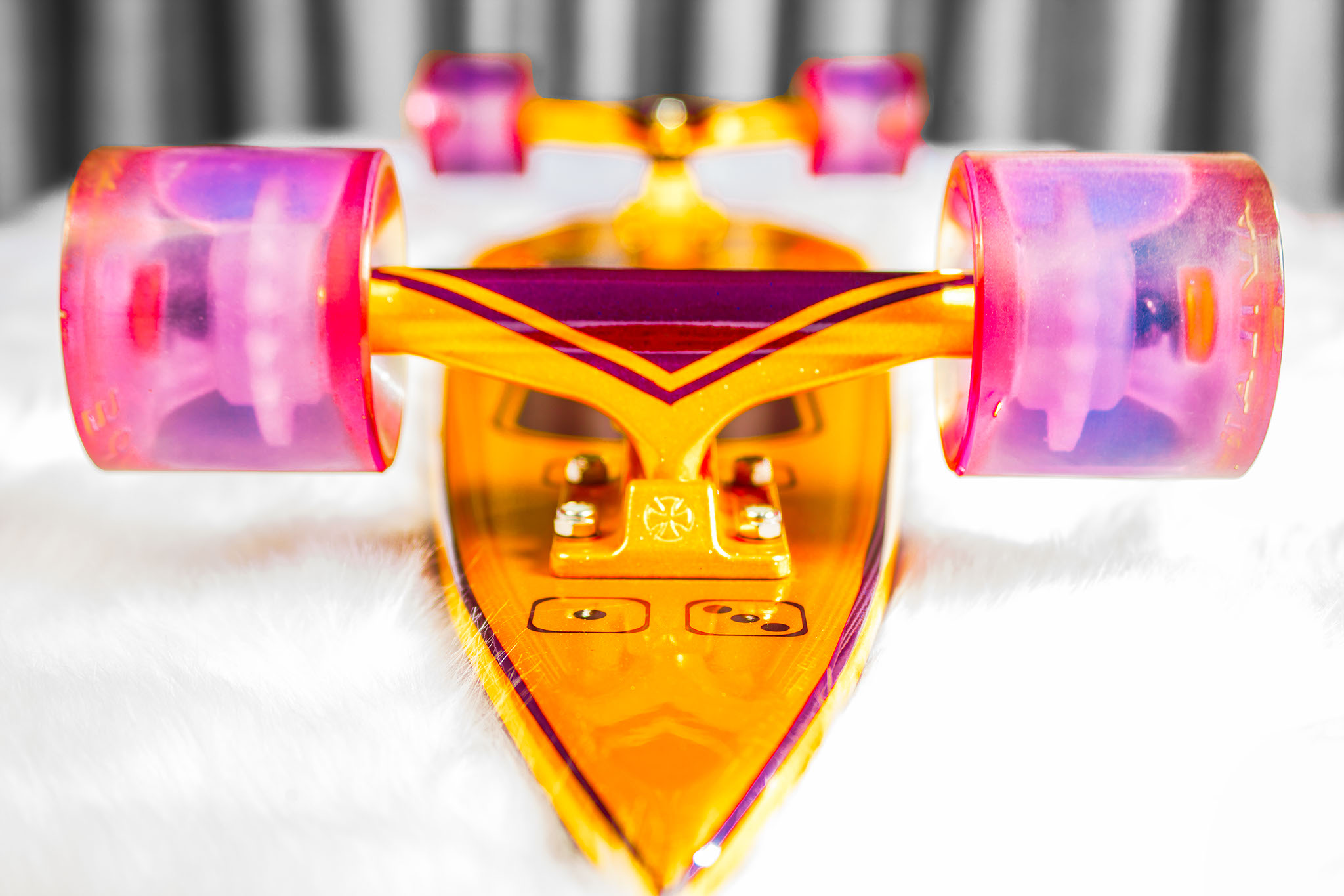Painted Birch Ply Construction- Gold metallic and purple House of Kolor paint and clear coat. Lightning bolt crushed glass grip. Independent Trucks with 75mm 3DM Avila Wheels with Gold Disk bearing covers. Ready to Paint Decks Starting at $229. Complete, As Pictured: $699. Other Team Paint Schemes Available.